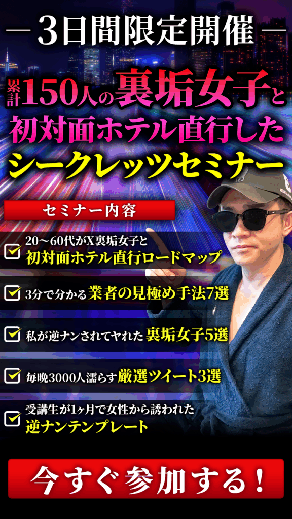 なお、Xの注意点については「オフパコは無料でできる!本当にヤれるアプリと裏垢女子を探す方法」で詳しく解説しているので、読んでおいてください。