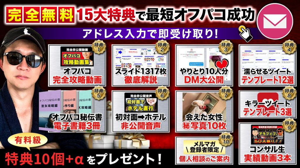 具体的な業者の見分け方や、女性から反応がもらえるプロフィールの作り方については、「オフパコ成功プレゼント15点セット」にて図解付きで詳しく解説しています。