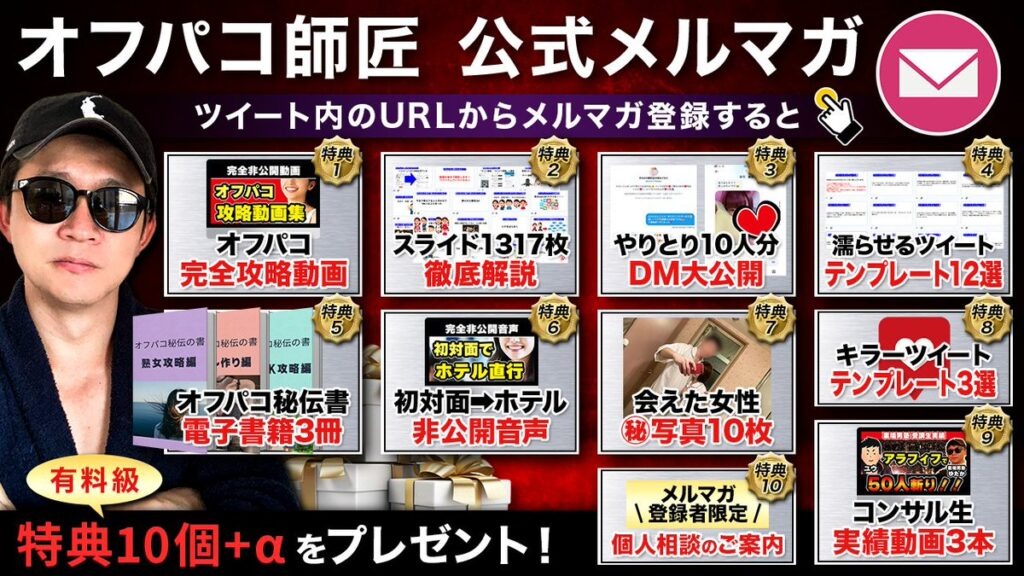 素敵な相手を見つけても、アプローチを間違えれば嫌われます。「オフパコ成功プレゼント15点セット」では、積極的な女性の心を開くための「大人のDM術」を公開しています。